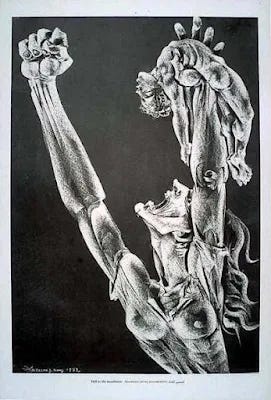 صراخي... يعانق الفلسطيني تحت الأنقاض وفوقها ويحتضن اليهودي الذي يبدو في رعب تام مثل أولئك الذين جردوا من إنسانيتهم وأُبيدوا مثل "جرذان" بالأمس لكنهم يقصفون ويبيدون الآخرين على أنهم "دون البشر" اليوم.